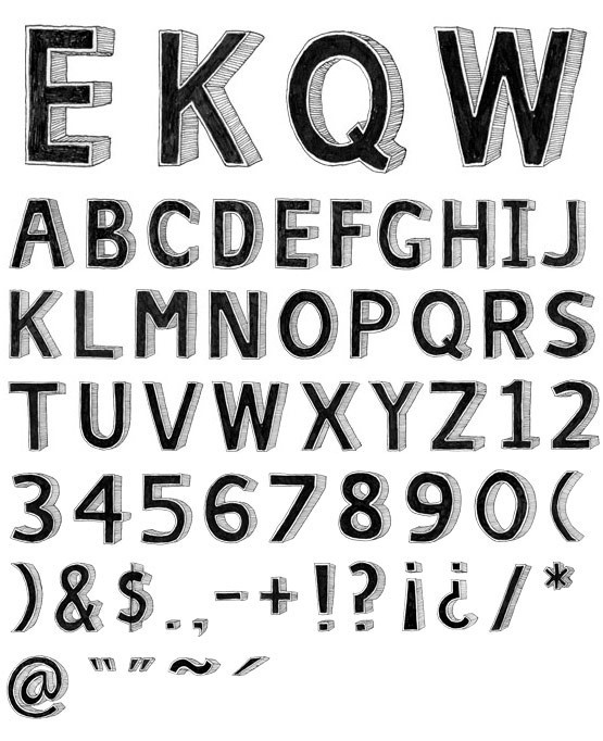 Bold and heavy with a fun and playful 3D look, these sketchy, extruded characters are great for headlines and anything needing a heavy yet impactful typeface. Custom, hand-drawn, sans serif type set. Its uppercase characters are 3” high at 300 dpi. Note: Individual type sets are available as a digital download only. (via Volume1 Type01 – Individual Type Sets)