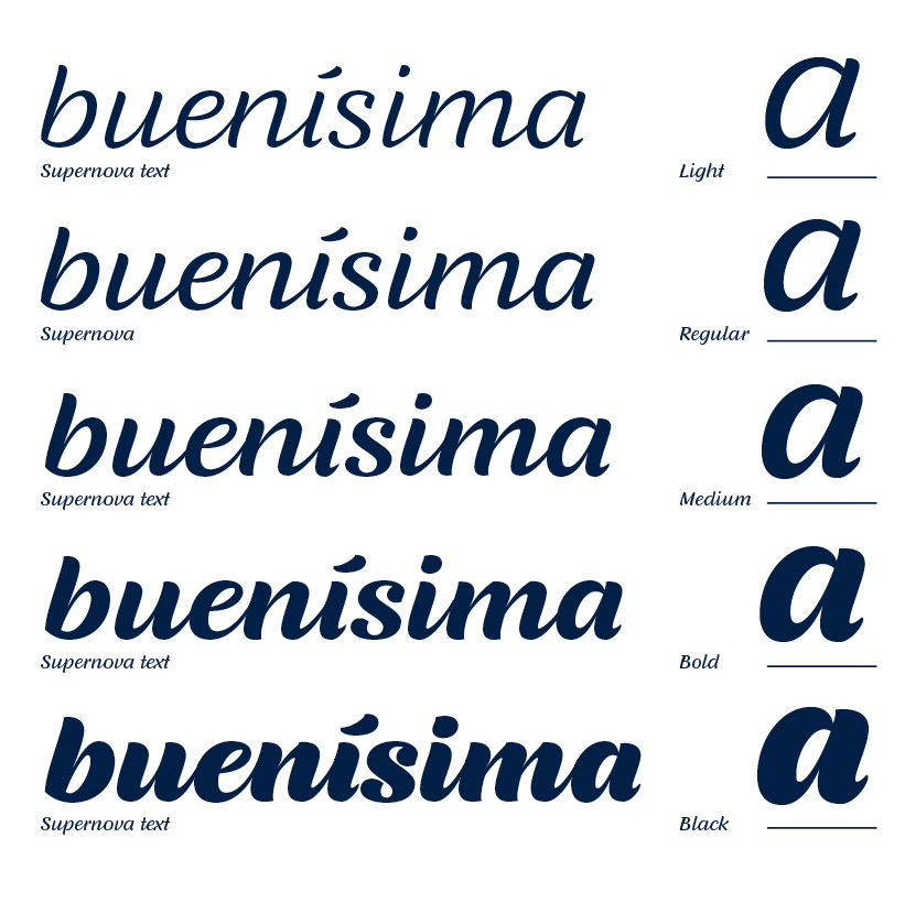 Supernova is a new family that combines the spontaneity of a script typeface with the versatility of multiple weights and cuts.