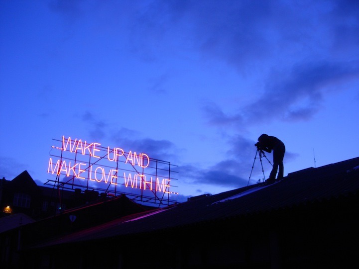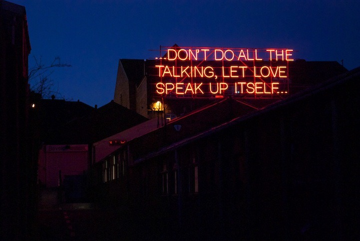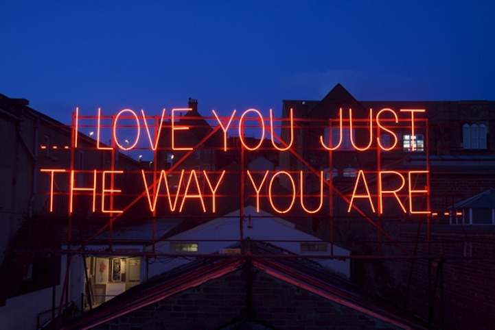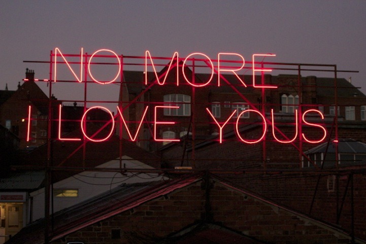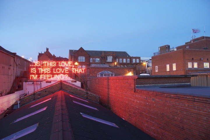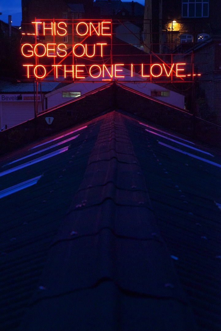 12 Months of Neon Love is a collaboration between Victoria Lucas and Richard William Wheater, and began on St Valentines day 2011. The project is formed using a sequence of twelve lyrical statements, borrowed from well-known songs that feature the many configurations of love. Presented over a year in large red neon text, twelve expressions are visually re-presented to an unsuspecting audience going about their everyday lives on the roof of Neon Workshops in Wakefield.