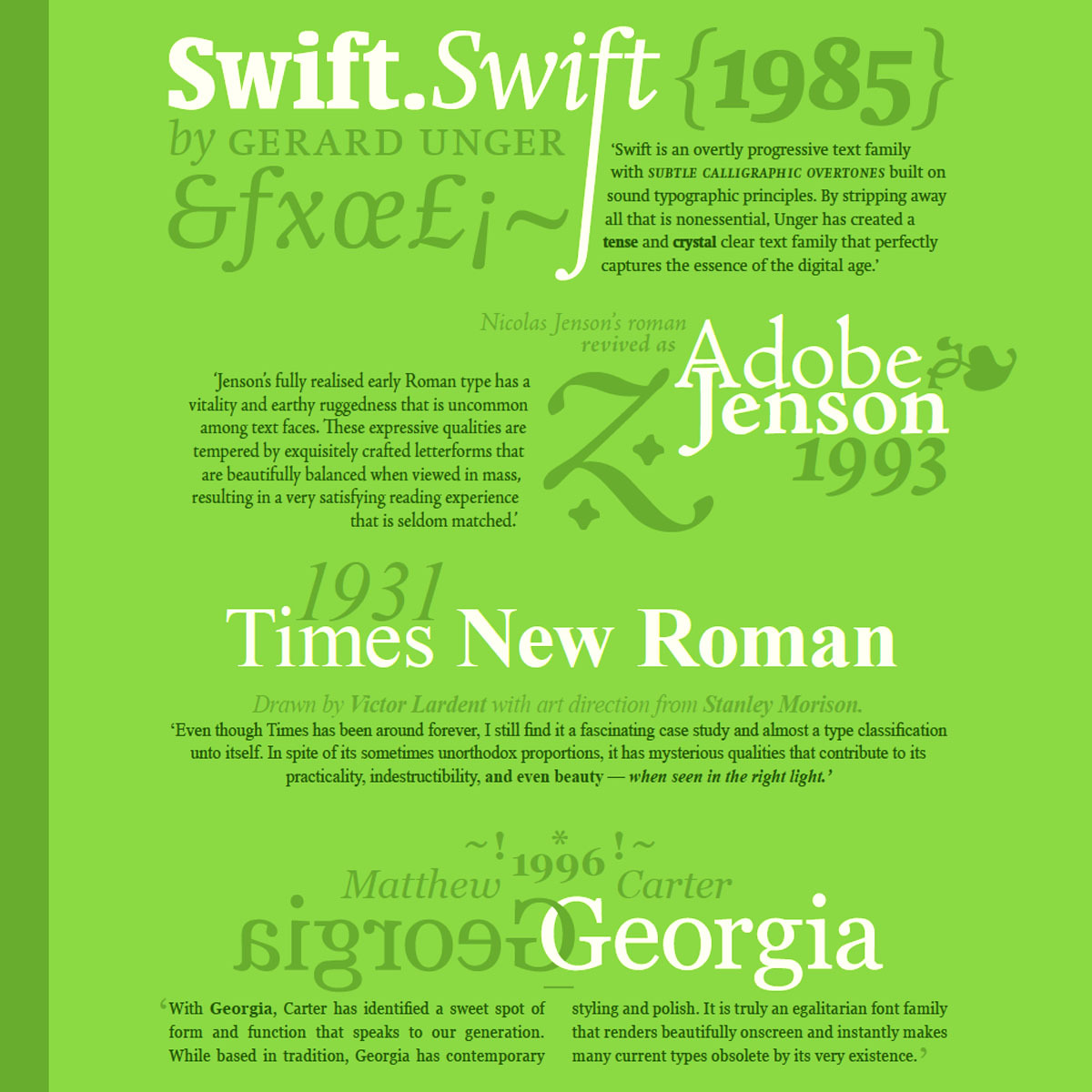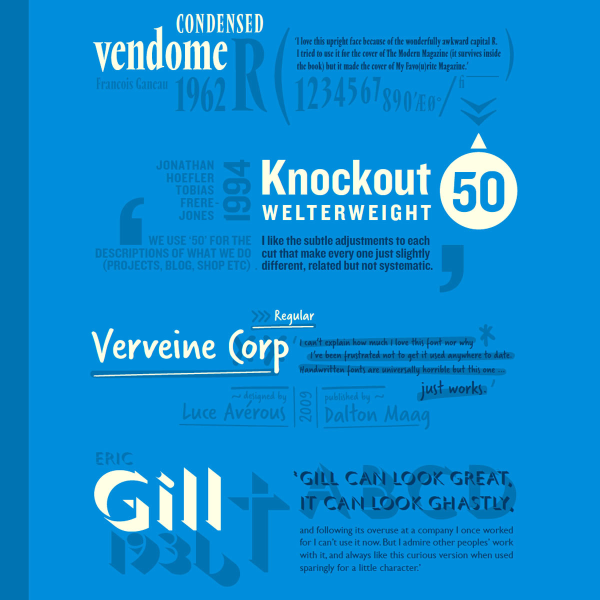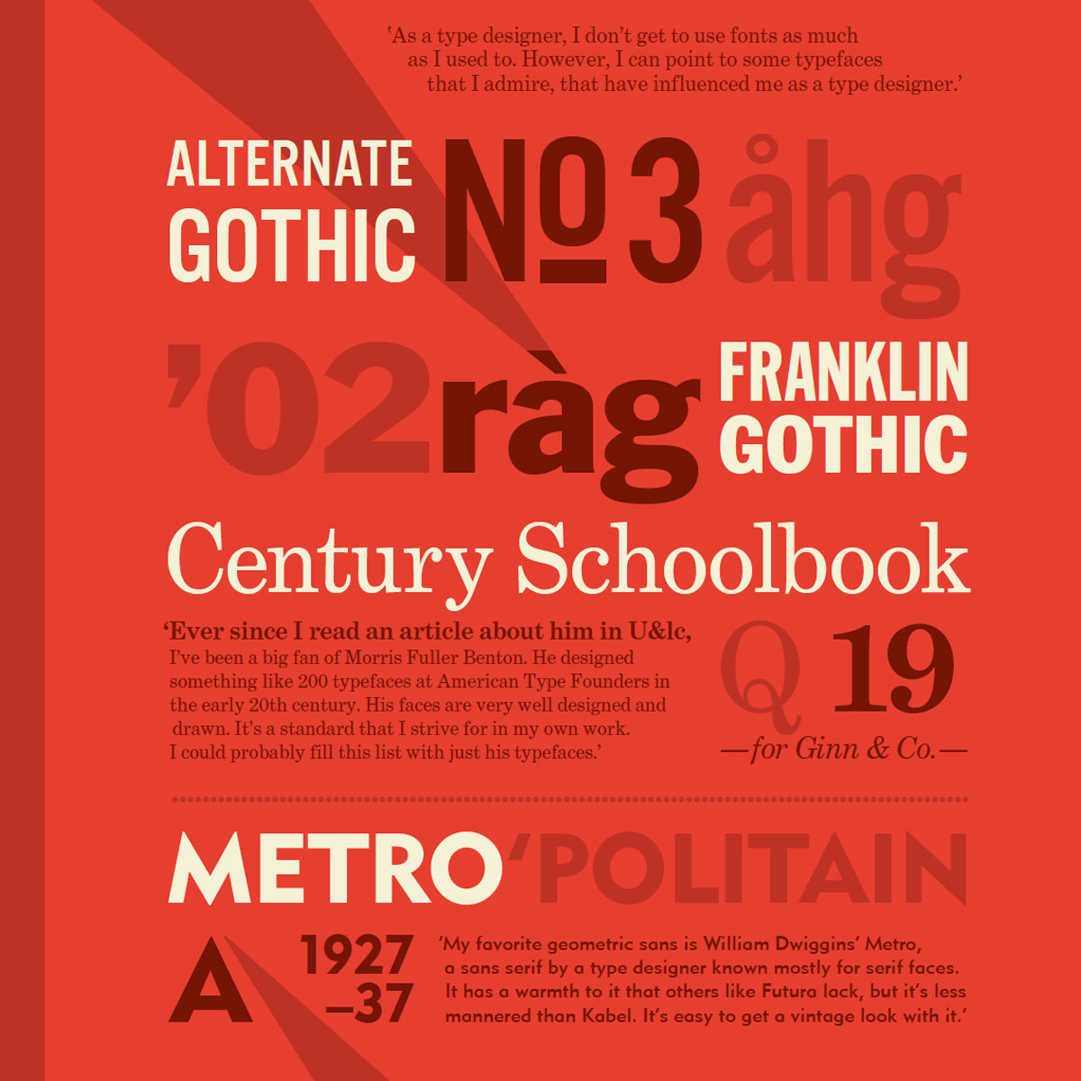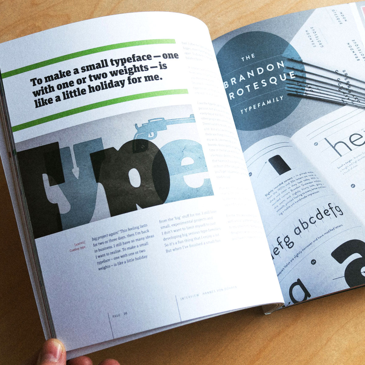 Over the course of 8 Faces’ life, we interviewed 64 Type designers, graphic designers, web designers, illustrators, and artists, and set some beautiful type specimens for their eight favourite typefaces. We also published forewords and essays by a number of thought-leaders in the design industry, making 8 Faces a source of knowledge as well as inspiration.